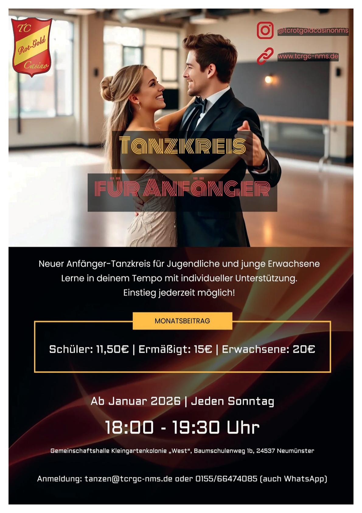 Neues Jahr, neuer Kurs, so dachte sich das zumindest unser Verein und hat pünktlich zum Tanzjahr 2026 einen neuen Kurs ins Leben gerufen. Sonntags um 18:00 Uhr wird im neuen Anfänger- und Wiedereinsteigertanzkreis mit dem neuen Trainer Syd Winkler das Tanzen von Grund auf neu......